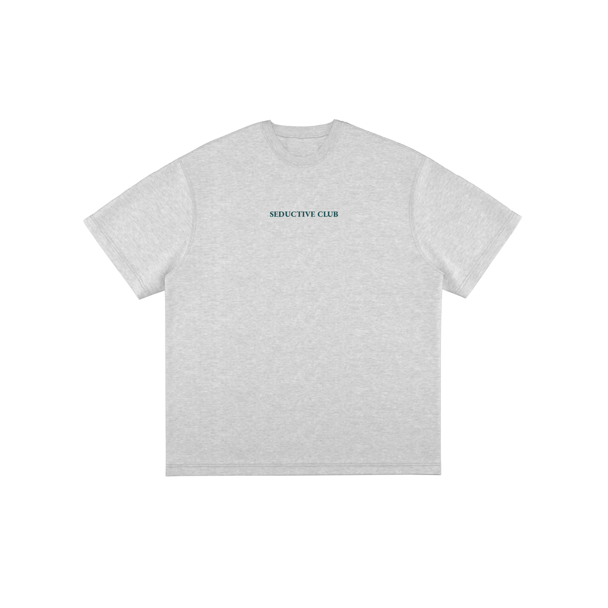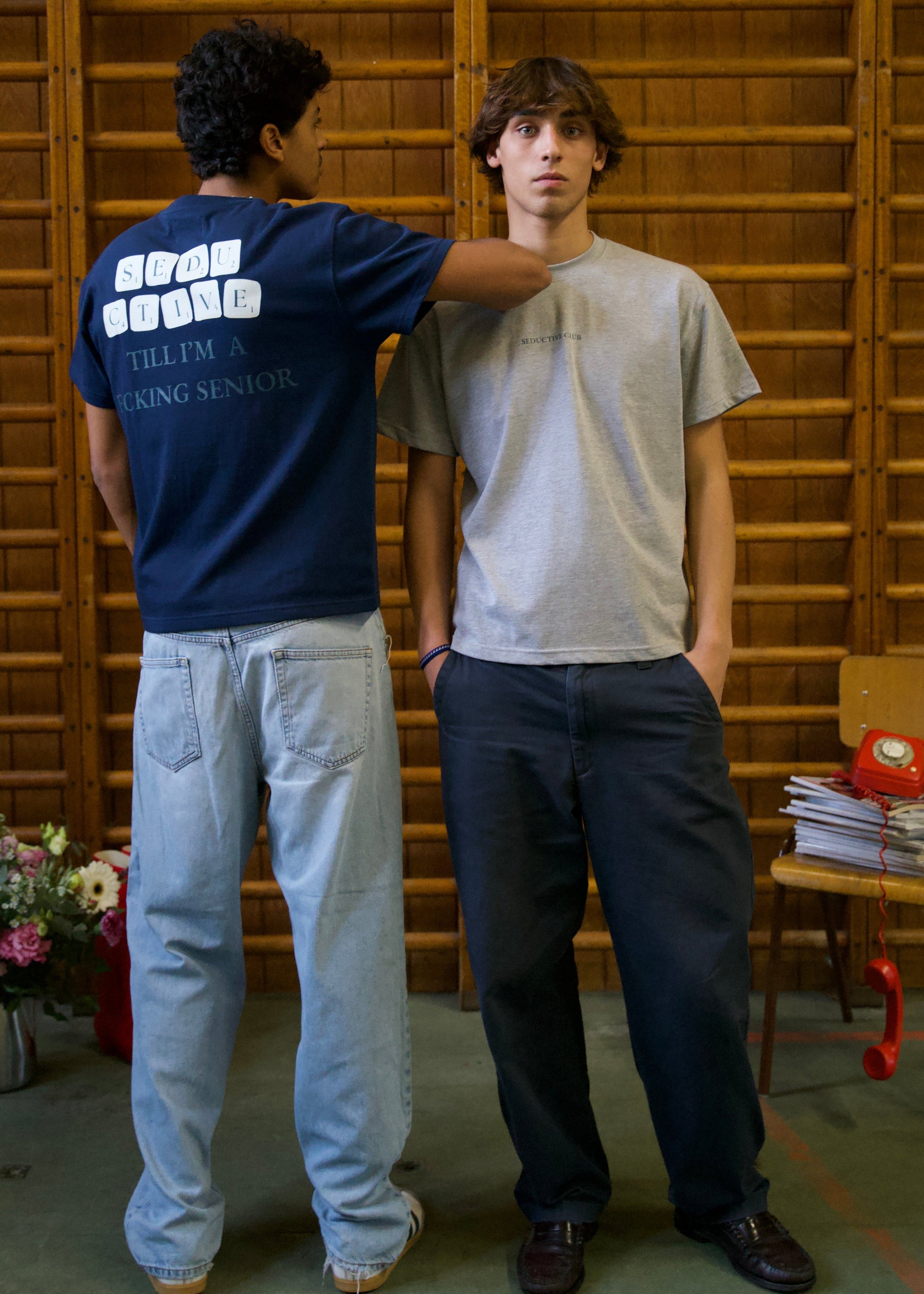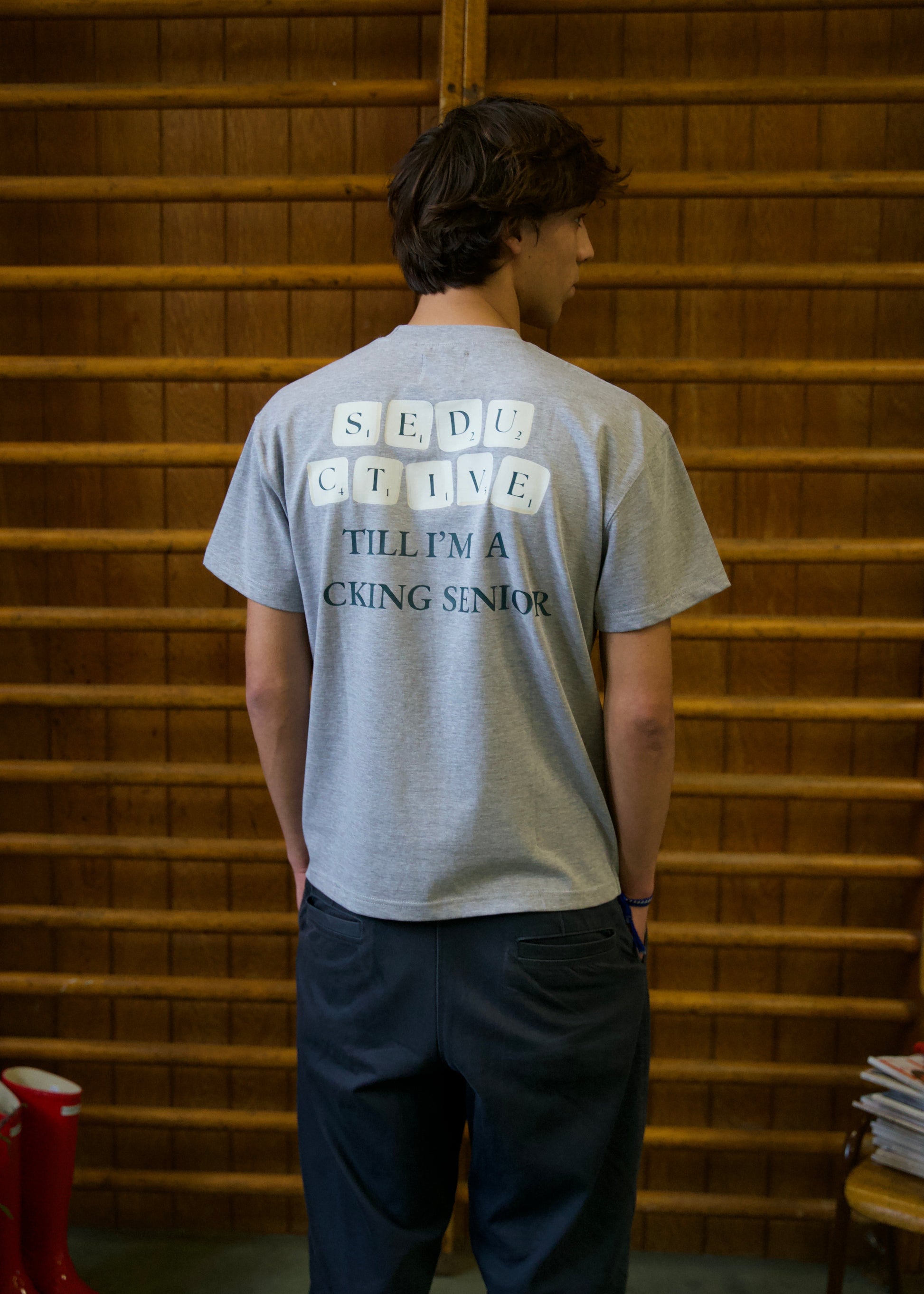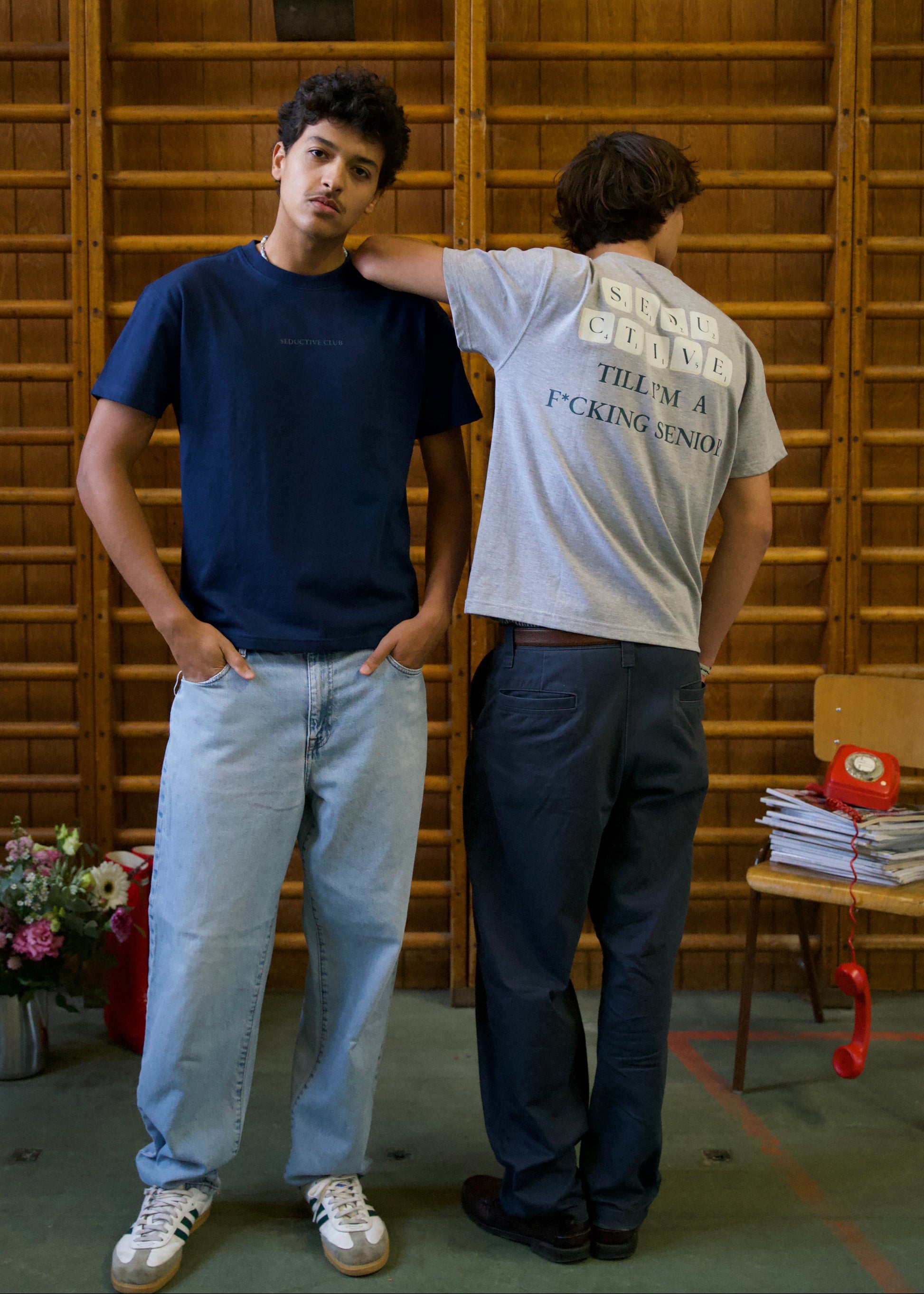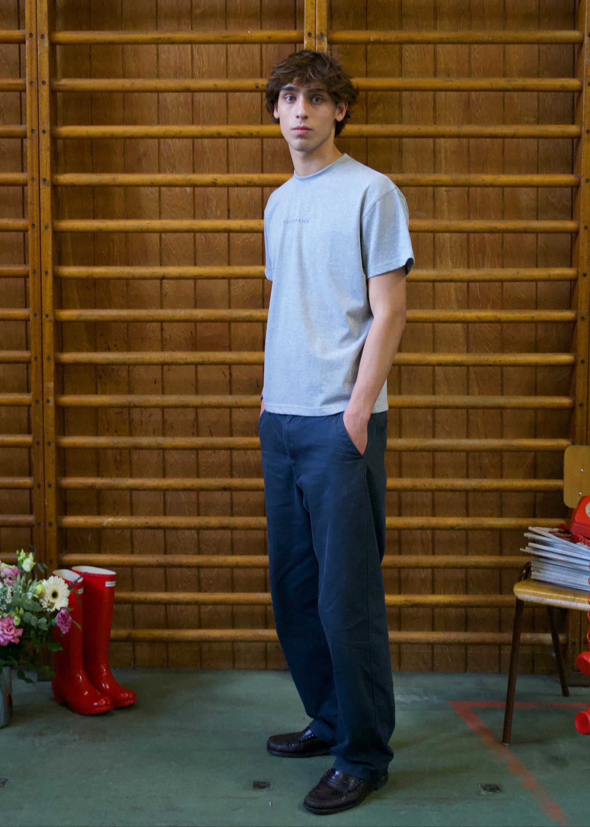 Charles is 1m90 and wears the grey scrabble tee in size M