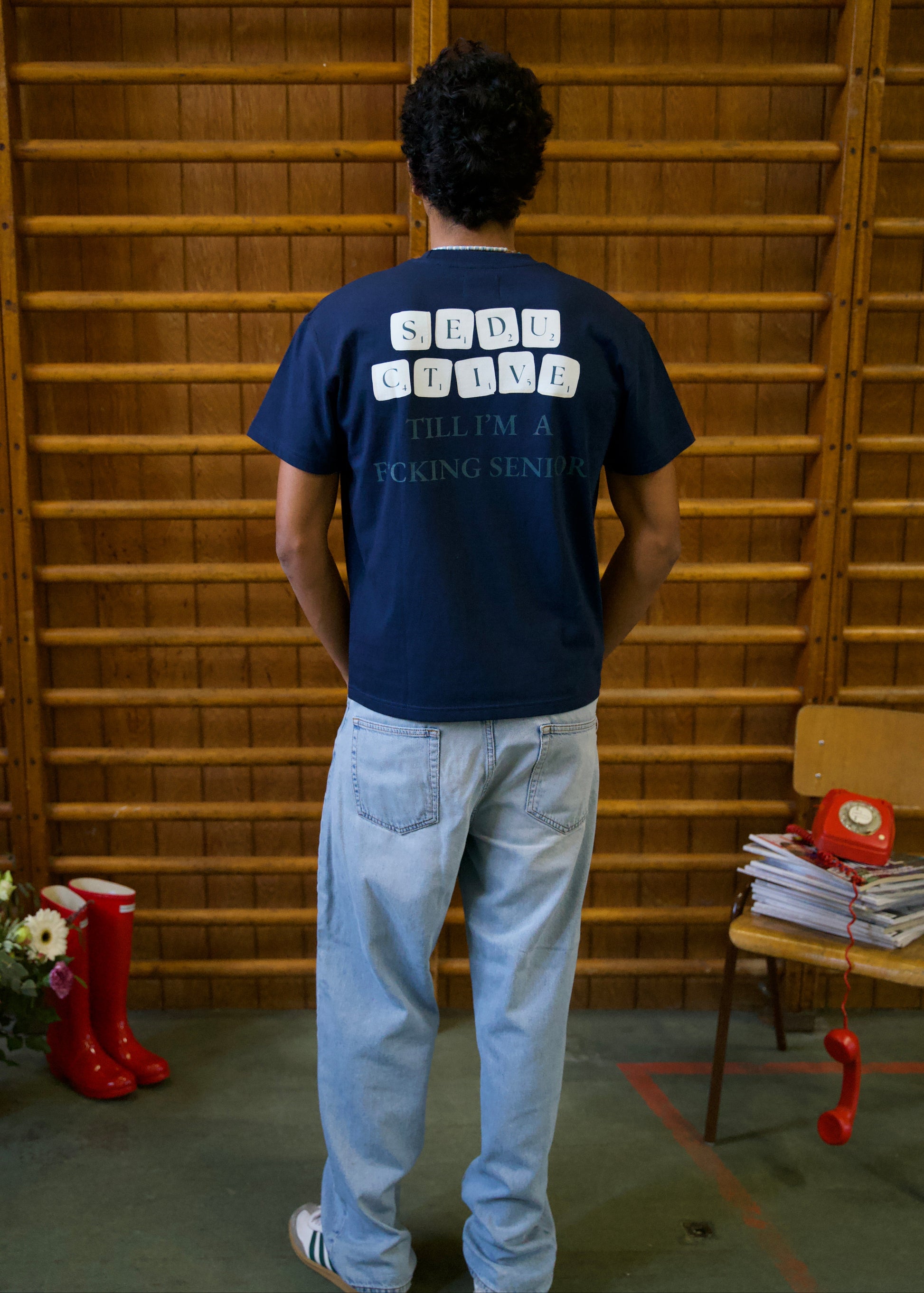 Sam is 1m94 and wears the grey scrabble tee in size M